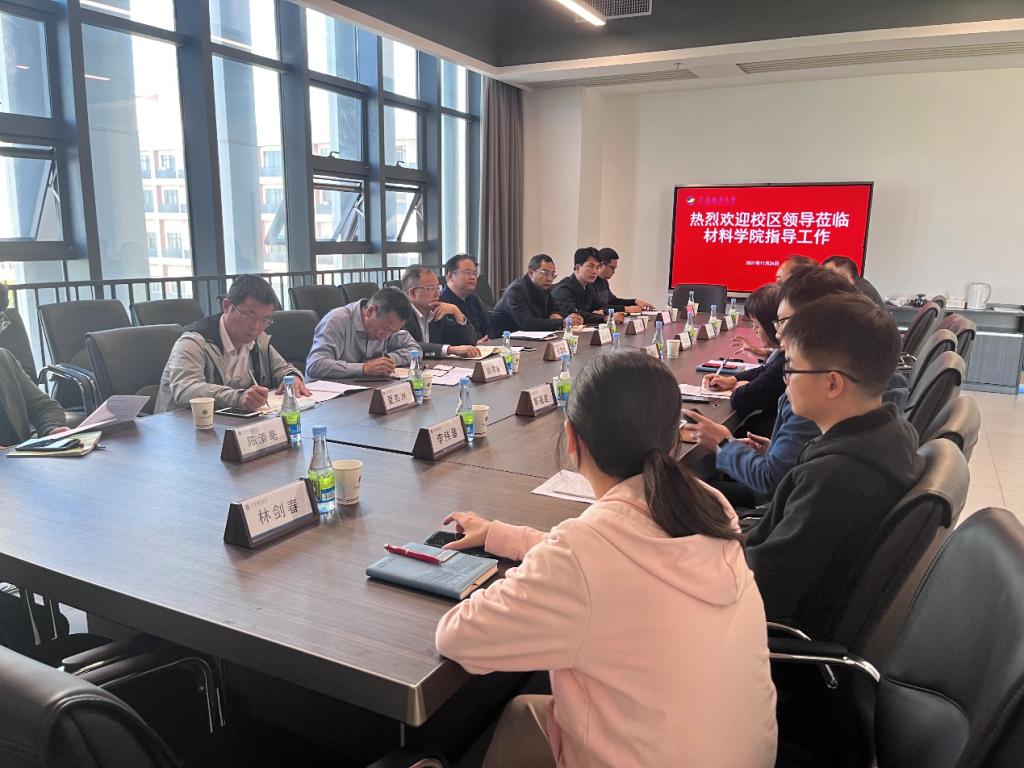 11月24日,开云kaiyun登录入口阳江校区管委会常务副主任周昌仕到材料学院调研,强调要加强党建工作,深入学习贯彻习总书记在党的十九届六中全会上的重要讲话精神和全会精神;加快师资队伍建设和实验室建设,加强科研工作力度;提高教学质量,重视课程思政,多渠道提高青年教师教学能力。