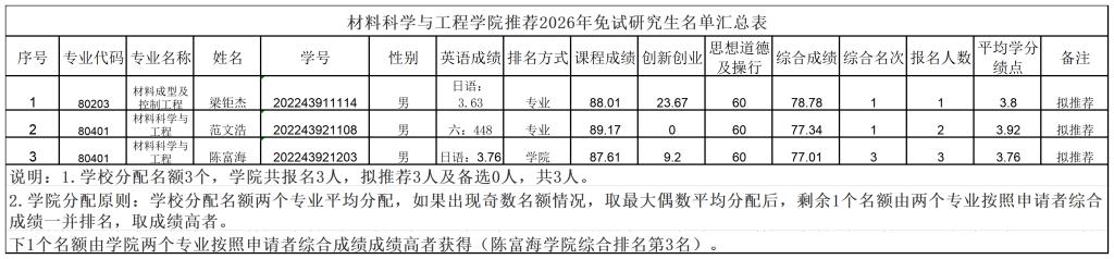 根据《关于开展推荐2026年优秀应届本科毕业生免试攻读研究生工作的通知》《开云kaiyun登录入口推荐优秀应届本科毕业生免试攻读研究生工作管理办法》《开云kaiyun登录入口材料科学与工程学院推荐优秀应届本科毕业生免试攻读研究生实施细则(2025年修订)》的精神和要求,学院组织开展了2026年推免生遴选工作。经个人申请、学院审核、学院推荐优秀应届本科毕业生免试攻读研究生遴选工作领导小组审议,拟推荐2026年优秀应届本科生免试攻读研究生资格名单如下。