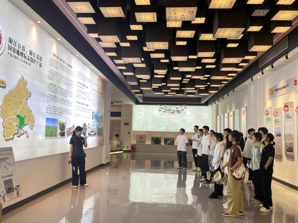 在非遗馆内,讲解员详细介绍了阳江豆豉的发展历程及其在古代饮食文化中的重要地位。同学们通过观摩传统豆豉酿制工具和图文展板,深入微生物制曲车间,亲临阳帆封闭天然晒场,近距离观察并学习了这一百年非遗技艺“古法酿造,天然生晒”的独特工艺与现代科学管理的融合,对豆豉从原料发酵到成品晒制的全过程有了直观深刻的认识。