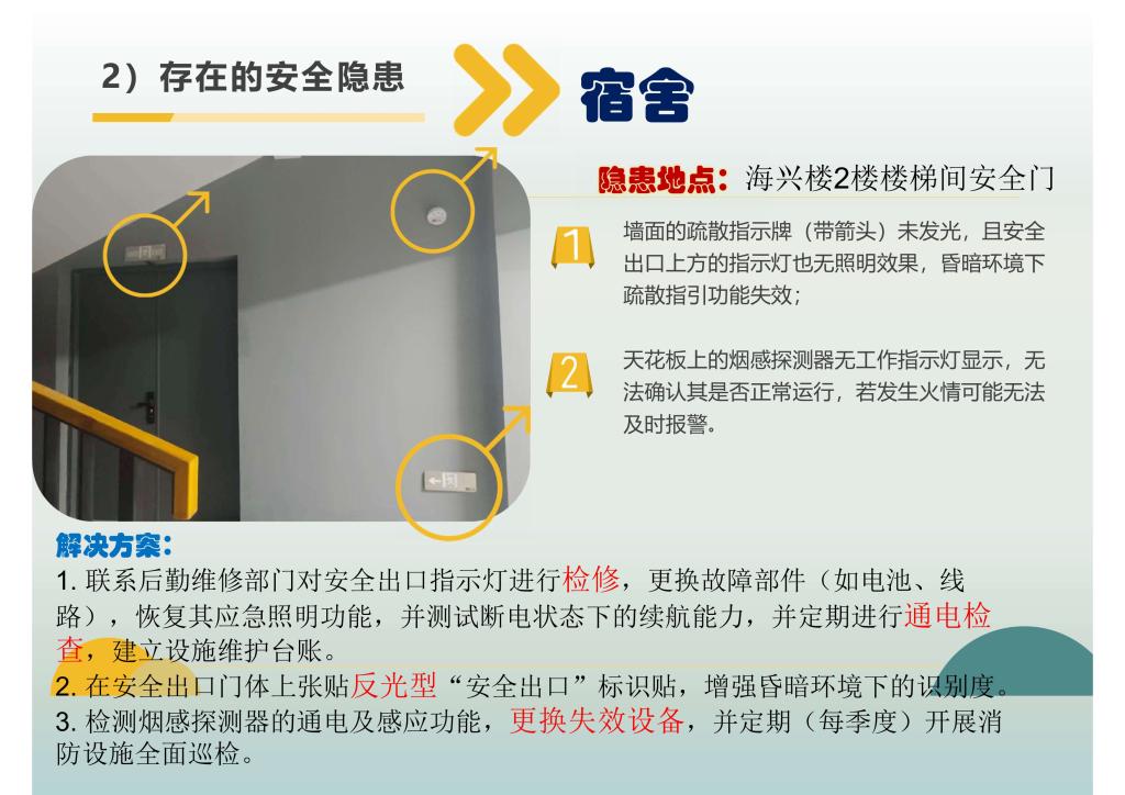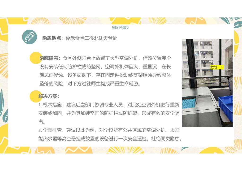 本次活动以“立足生活,守护安全”为主题,号召全校师生用镜头捕捉校园安全隐患,共同守护平安校园。活动自启动以来,得到了众多师生关注与参与,累计收到各类隐患线索百余份。经初步筛选与集体评审,共确定高质量有效提案51份,其中10份兼具创新性与可操作性的提案获评“十佳提案”。同学们通过图文并茂的方式,直观展现了隐患情况并给出切实可行的整改建议,相关线索与提案内容主要涉及宿舍用电安全、食品卫生保障、教学设施维护等多个领域,部分还聚焦台风后未整改到位的安全隐患区域,充分彰显了广海学子心系校园安全的责任与担当。