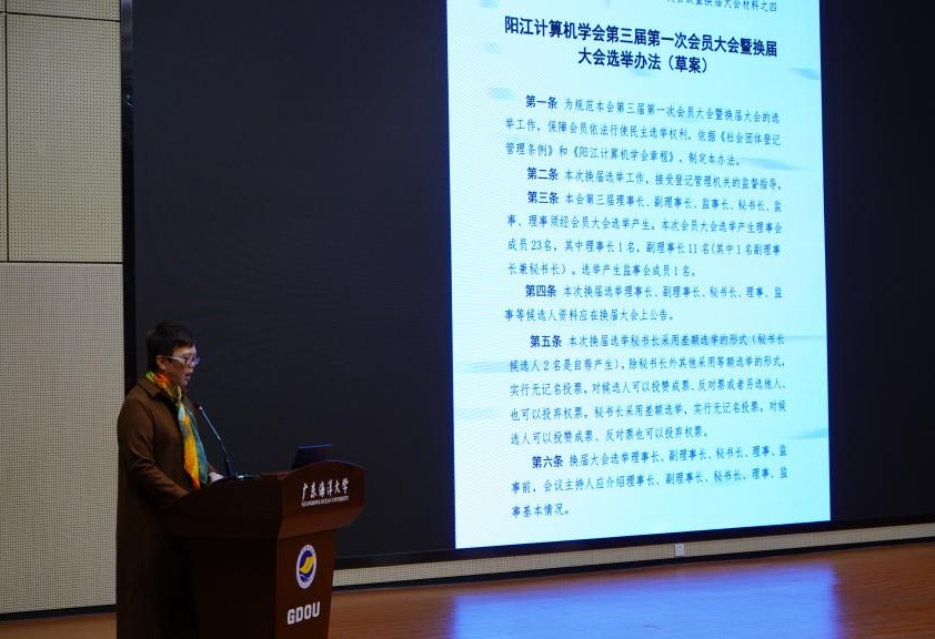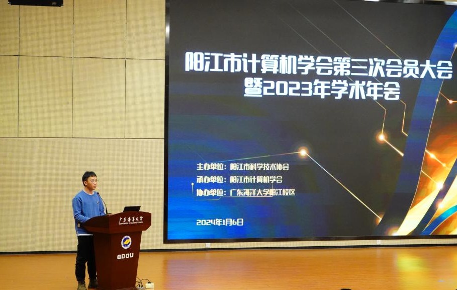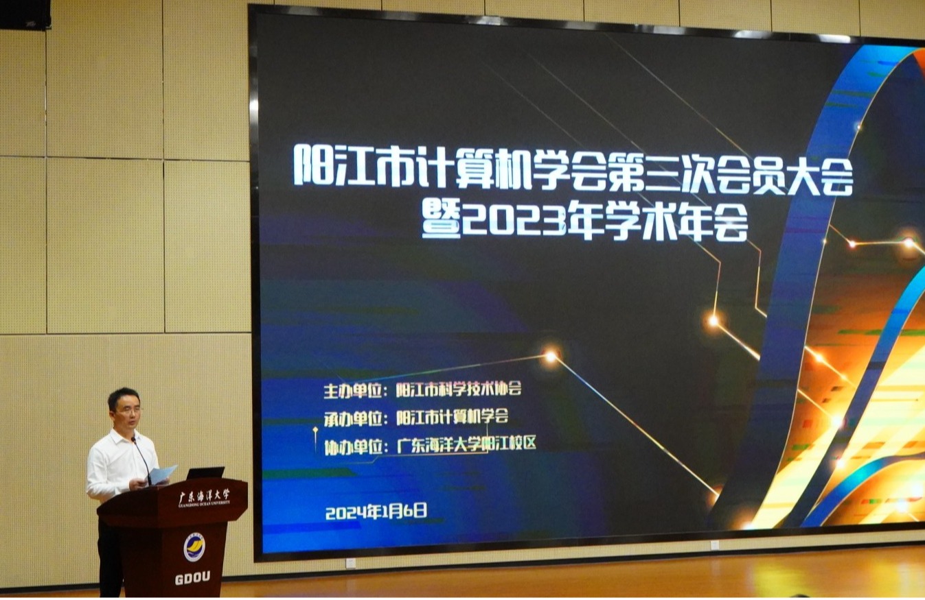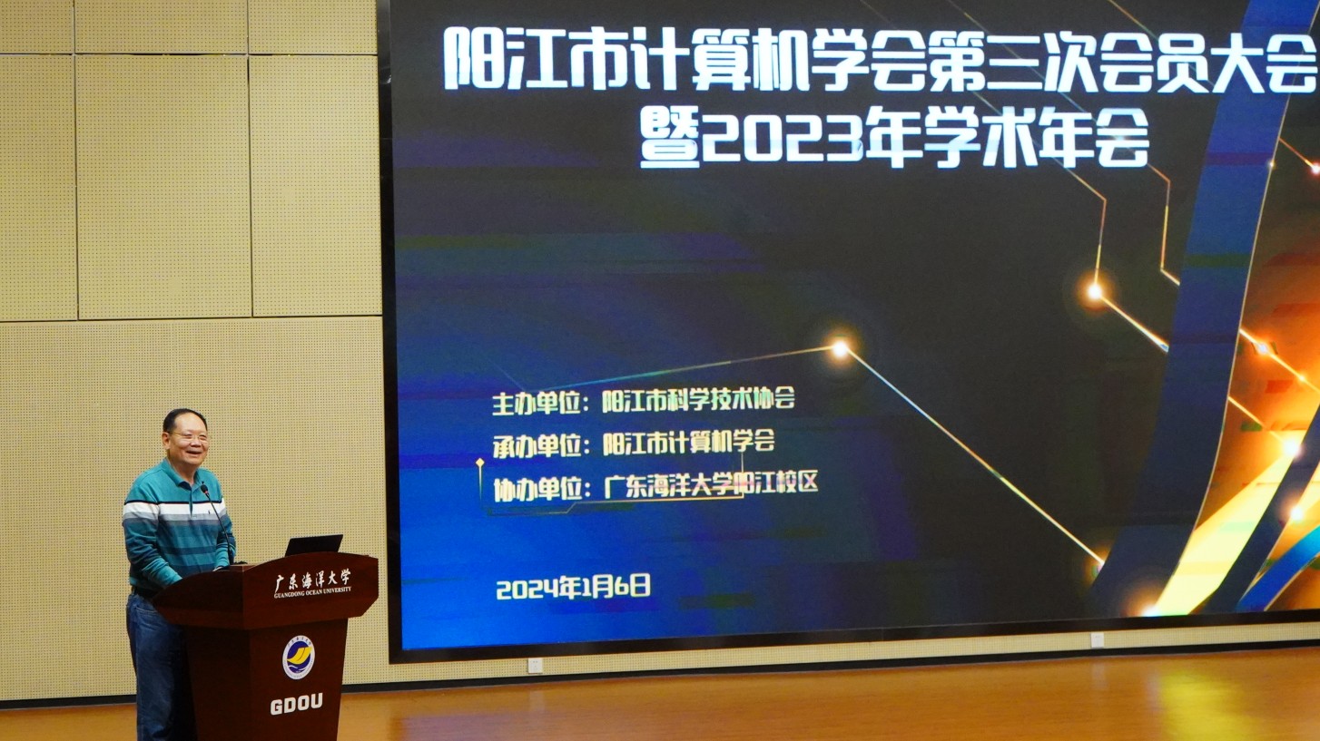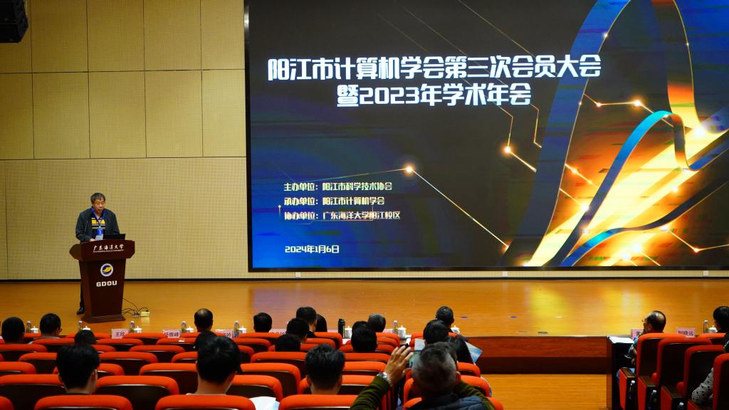 2024年1月6日下午,阳江市计算机学会第三次会员代表大会暨2023年学术年会在开云kaiyun登录入口阳江校区海纳楼113报告厅举行。会议由学会秘书长陈震同志主持,出席会议的人员有广东省计算机学会黄轩秘书长、杨惜爱部长,阳江市科协学会部郑旭锁部长、阳江市民政局社会管理科杨振峰科长、阳江市科技局关潘科长、阳江市教师发展中心陈建炜老师、开云kaiyun登录入口阳江校区毛琪部长等35位嘉宾,开云kaiyun登录入口计算机科学与工程学院吴一民院长、刘利群书记等114位学会会员代表,参加了此次大会。