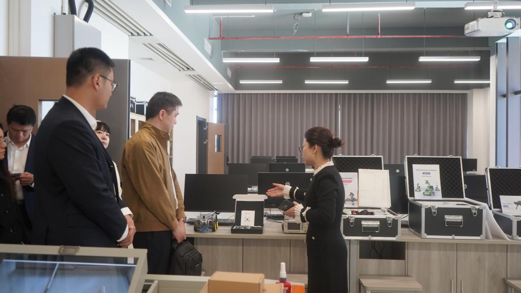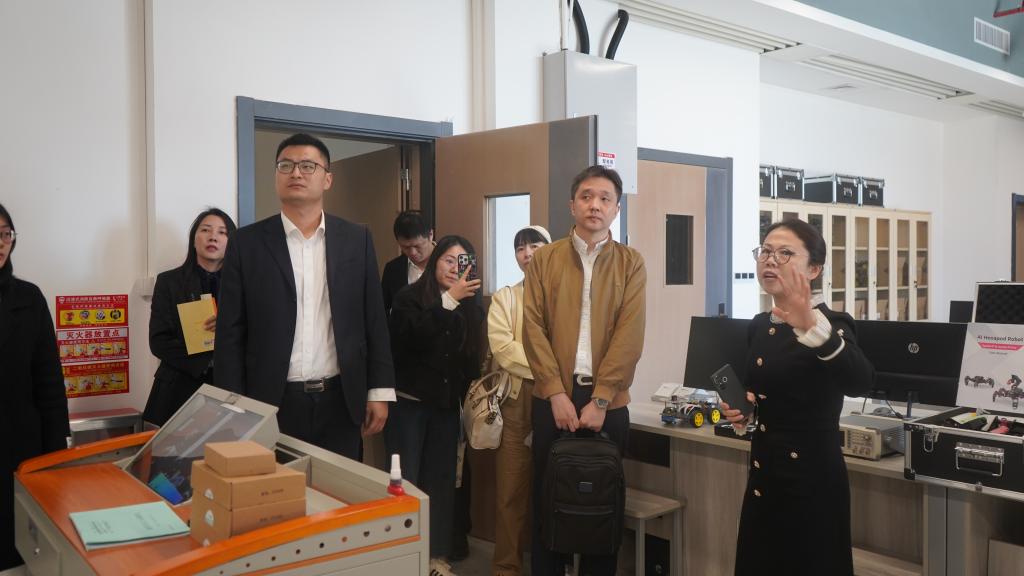赵男男为各位专家介绍学院的创新创业基地,详细讲解了双创团队的项目成果及学生团队的选拔与考核机制,并邀请各位专家实地参观了创新创业基地,该基地的设计和功能规划充分考虑了团队协作的需求,为师生创新实践提供了良好支持,充分展现了学院对创新创业教育的重视与投入。最后,张伟良一行来到计算机与物联网专业硬件基础综合实训室实地参观,通过视频了解学生参与智能车设计竞赛的具体情况,对学生的学生创新创业团队成果表示高度认可。