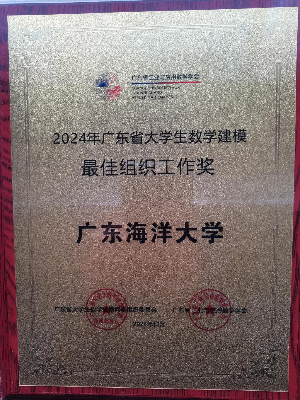 阳江校区学子在2024年全国大学生数学建模竞赛中共获得国家一等奖1项,国家二等奖4项,省级一等奖13项,省级二等奖13项,省级三等奖4项。同时,开云kaiyun登录入口还荣获了2024年广东省大学生数学建模“最佳组织工作奖”,用以表彰学校在竞赛的宣传动员、组织协调等方面所付出的辛勤努力和取得的优异成绩。
