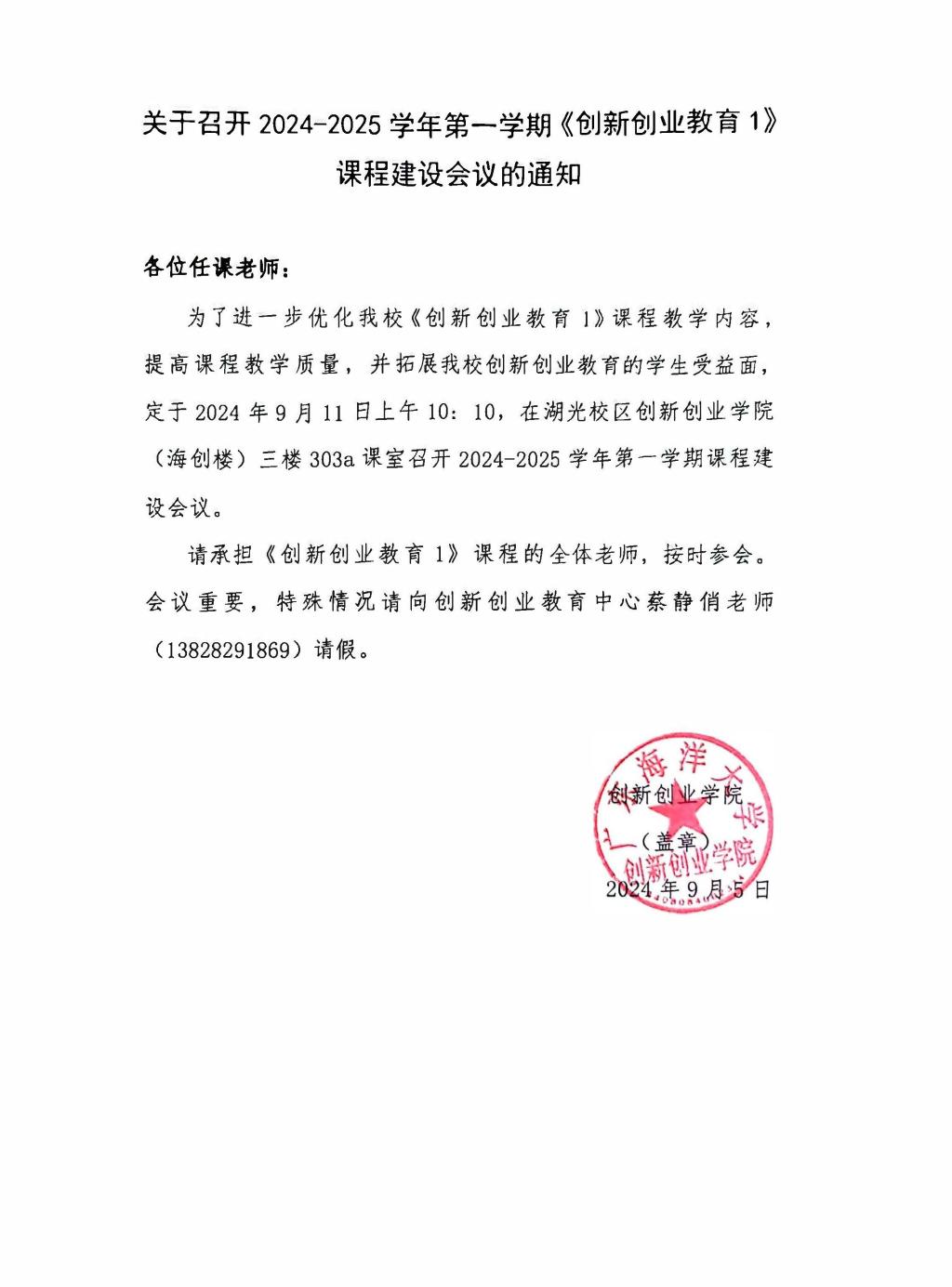 为了进一步优化开云官网《创新创业教育1》课程教学内容,提高课程教学质量,并拓展开云官网创新创业教育的学生受益面,定于2024年9月11日上午10:10,在湖光校区创新创业学院(海创楼)三楼303a课室召开2024-2025学年第一学期课程建设会议。请承担《创新创业教育1》课程的全体老师,按时参会。
