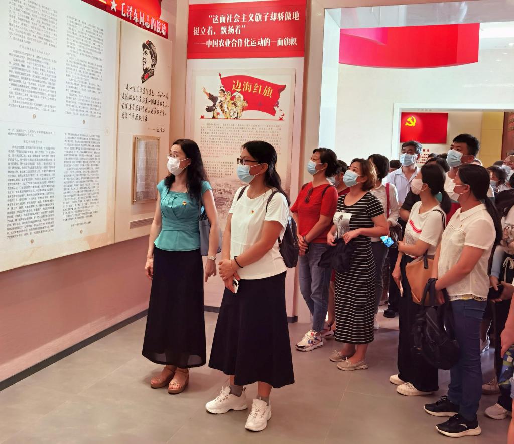 在阳西县儒洞镇边海村红色展馆,讲解员带领大家回顾了边海村的红色革命历史,特别是中华人民共和国成立以来,边海村筚路蓝缕、栉风沐雨的峥嵘岁月以及垦荒造田、引水灌溉的历史,深入体会边海党支部战天斗地、拦河筑坝的斗争精神,开天辟地、围海造田的创造精神,让大家深刻领会党群连心、勇立潮头的精神实质。60多年前,毛泽东同志亲笔批示边海乡党支部为“模范的支部”。近年来,边海村更是通过弘扬传承“边海红旗”精神,以红旗精神推动乡村振兴战略,引领基层党建全面夯实,边海村新农村建设取得了显著成效。红色展馆中,展现的历史遗物、图片影像资料以及阳西革命先辈的革命历程,让大家经受了一次精神的洗礼和灵魂的升华,受到了一次深刻的党性教育。在鲜红的党旗下,刘艳带领党员重温入党誓词。