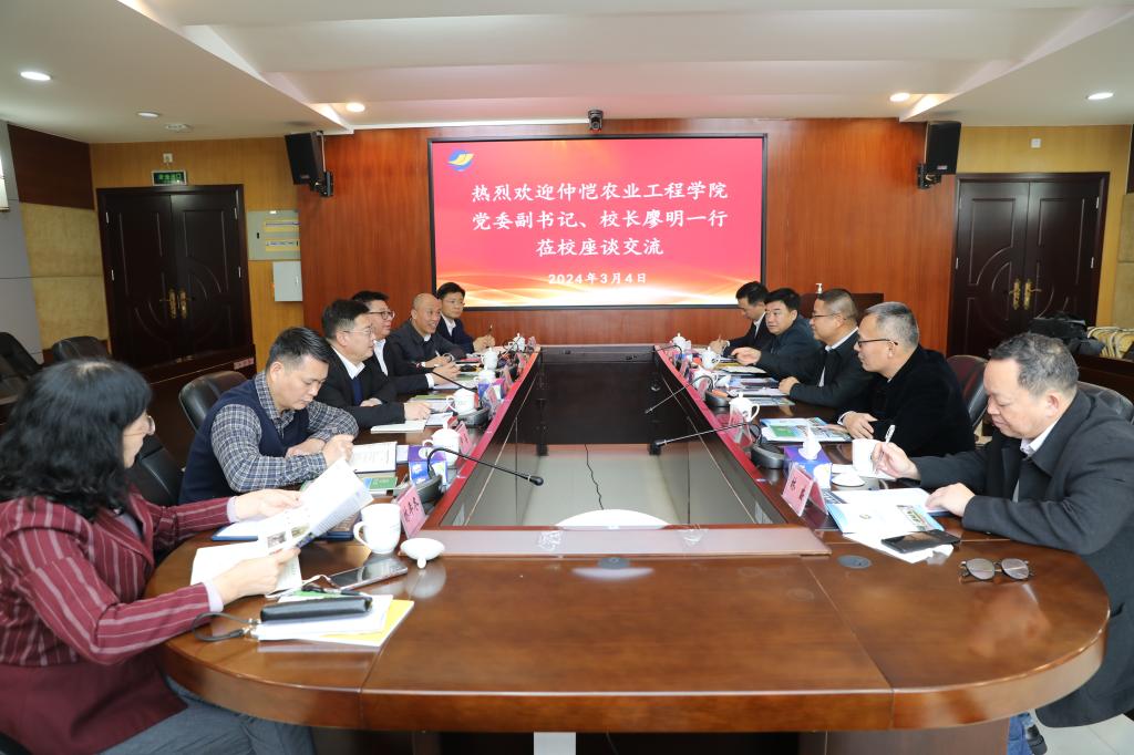 3月4日,仲恺农业工程学院党委副书记、校长廖明,党委常委、副校长张文峰一行5人到开云官网湖光校区调研,双方在行政楼四楼会议室召开座谈会。学校党委书记杨洲接待了来访人员并主持座谈会,党委常委、副校长谭北平出席座谈会。