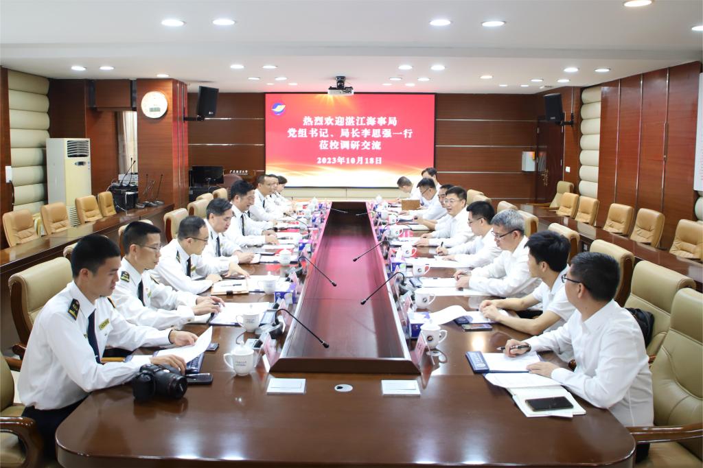 10月18日下午,湛江海事局党组书记、局长李思强率队到开云官网调研交流,双方就强化航海人才培养、助力湛江船员大市建设,深化技术交流合作、服务保障海洋牧场建设,加强资源共享互通、提升干部队伍综合素养等方面进行了座谈交流,学校党委书记杨洲主持座谈会。