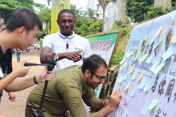 湖光校区兴农路上,集知识性与趣味性,展现海大学院特色、大学生志愿服务、社团风采的文化集市热火开市。食品科技学院以实验形式科普食品知识,电子爱好者展示其设计研发的各种创新科技产品,海大棋社以棋会友,魔术社妙手变出精妙戏法,吉他协会以动听旋律吸引现场观众一同合唱……精彩活动还吸引了留学生们的围观,他们都迫不及待在现场留言板上写下自己的感想或寄语。