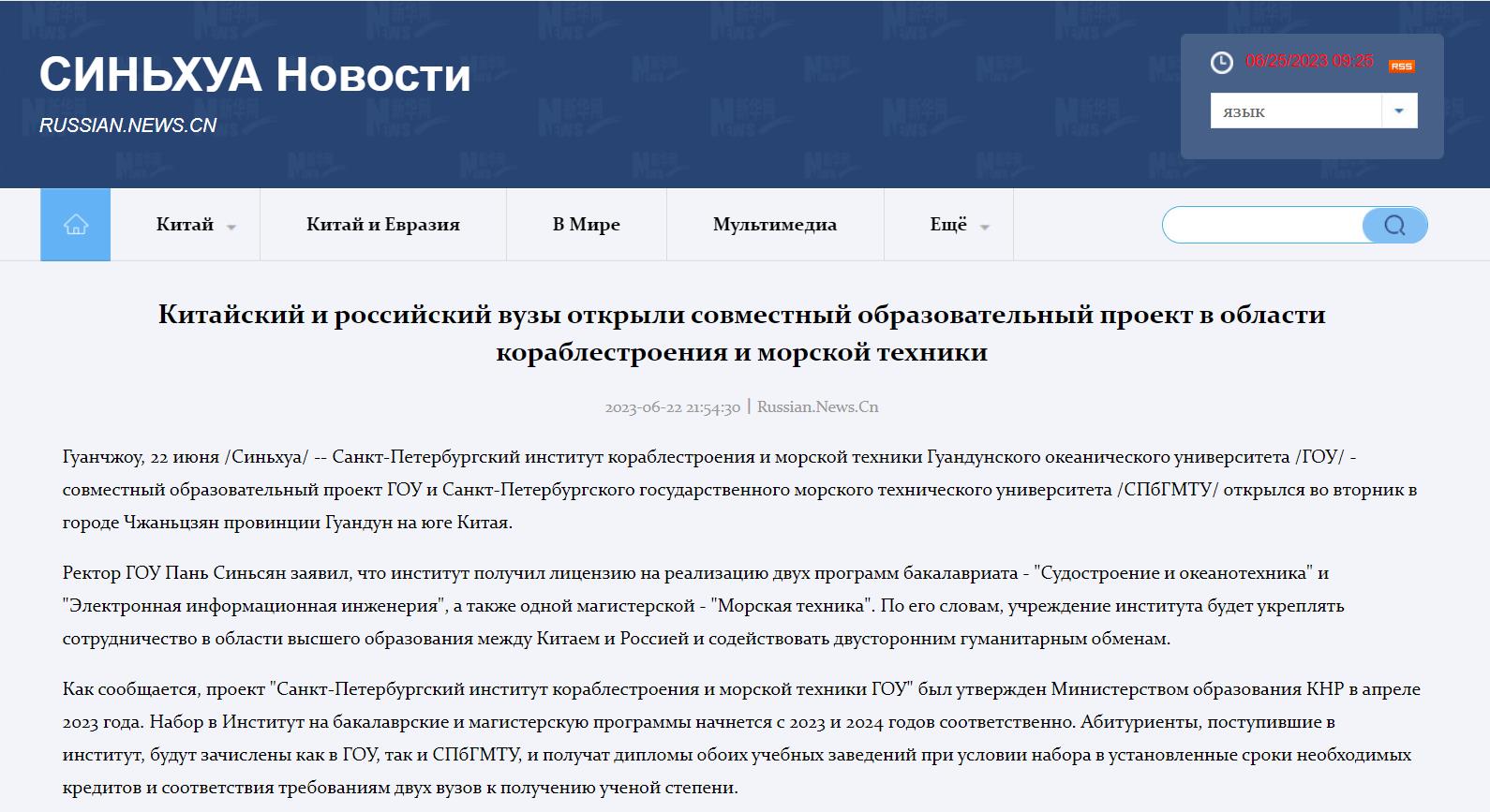 新华网俄文站:Китайский и российский вузы открыли совместный образовательный проект в области кораблестроения и морской техники