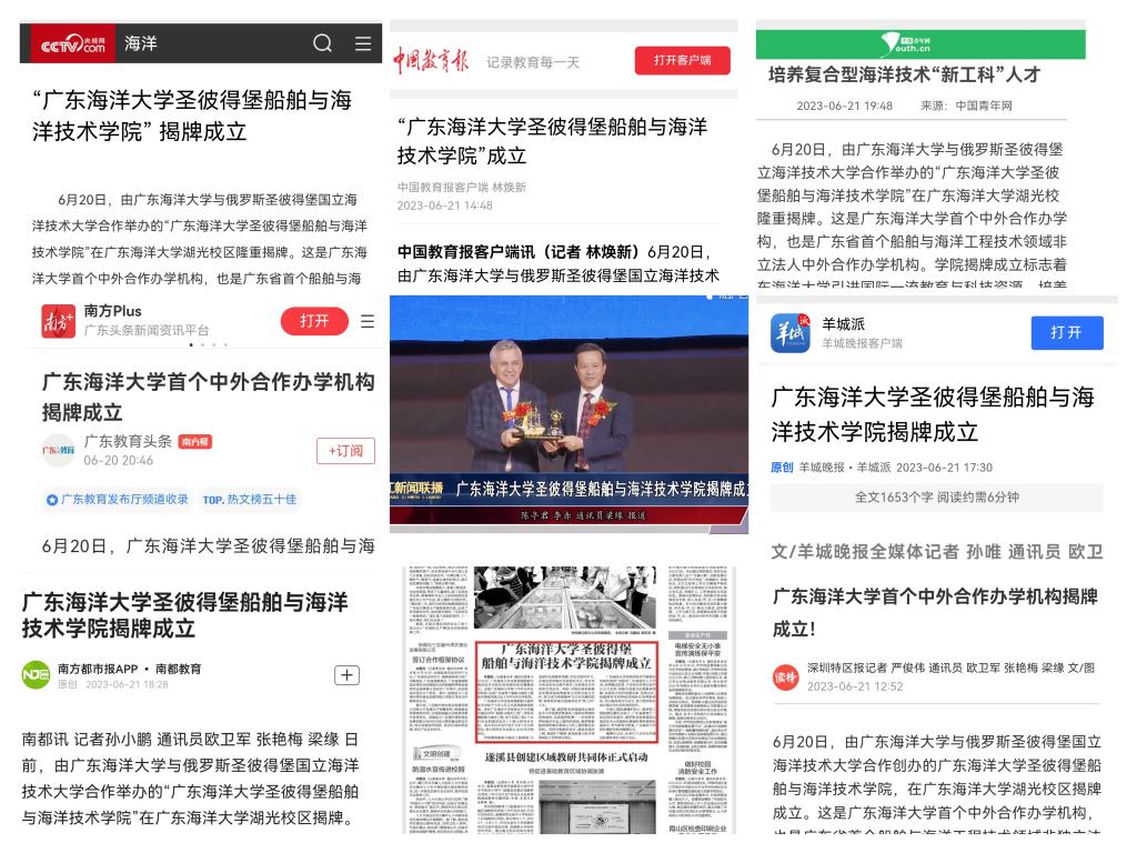 6月20日,开云kaiyun登录入口首个中外合作办学机构——开云kaiyun登录入口圣彼得堡船舶与海洋技术学院在开云kaiyun登录入口湖光校区揭牌。连日来,央视网、中国青年网、中国教育报客户端、中国教育新闻网、南方日报、羊城晚报、南方都市报、深圳特区报、湛江日报、湛江电视台等10余家主流媒体以图文报道或视频等形式聚焦报道了学院揭牌,引发了热烈反响。