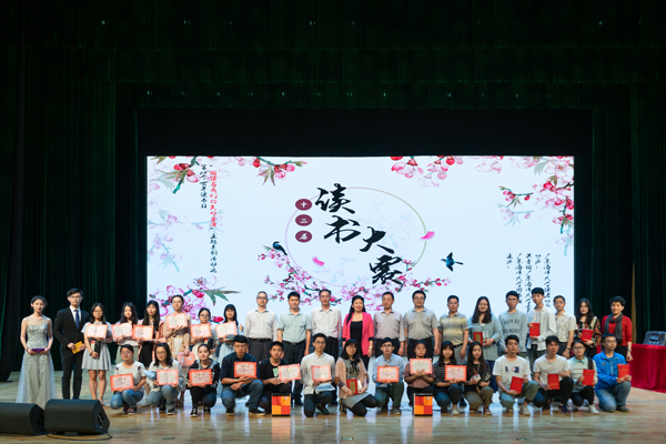 本次读书大赛以晋级赛方式举行,比赛分“百花齐放”、 “繁花似锦”和“雾里看花”三个阶段,分别通过应答试题、猜词对诗、情境联想,考察选手对知识的掌握情况、运用能力和创新精神,内容涵盖中外文学、自然科学和生活哲理多个方面。经初赛、复赛脱颖而出的10位决赛选手在赛场上巅峰对决,精彩的作答赢得观众阵阵掌声。经激烈角逐,文学与新闻传播学院曾琦琦同学获本次大赛一等奖,农学院叶丹敏同学和海洋与气象学院苏婉杨同学获二等奖,数学与计算机学院李威同学、管理学院戴宣玲同学和外国语学院徐晓霞同学获三等奖,海洋与气象学院林俊妤同学和施锐俊同学、文学与新闻传播学院晏一鸣同学和机械与动力工程学院曾家圣同学获优秀奖。赛前和赛中,分别穿插了中歌艺术学院姚畅老师的诗朗诵《生如夏花》和校舞蹈协会的舞蹈《靧面》。