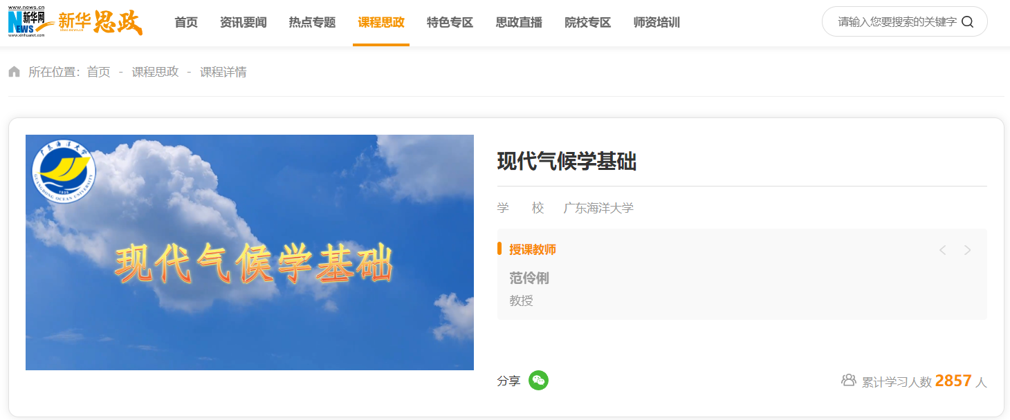 《现代气候学基础》课程是省级一流专业建设点——大气科学的核心专业课,是培养学生从事气候诊断与预测等岗位的导向课程,面向大学三年级学生开设。该课程为首批广东省课程思政示范课程,课程秉承立德树人的教育理念,将课程思政与专业教学有机结合,以学生为主体,通过启发式教学实现知识传授、能力培养和价值引领的融会贯通。