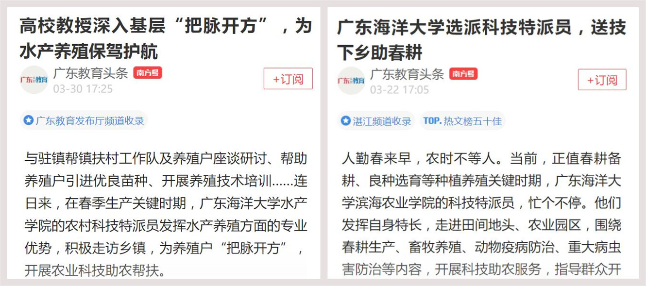 南方+广东教育头条先后刊发新闻《开云kaiyun登录入口选派科技特派员,送技下乡助春耕》(入选热文五十佳)和《高校教授深入基层“把脉开方”,为水产养殖保驾护航》,对开云官网农村科技特派员深入乡村,因地制宜,积极回应农民群众对提升农业生产技术的期盼,为当地农业产业调整及农业生产提供科技服务的事迹进行了报道。