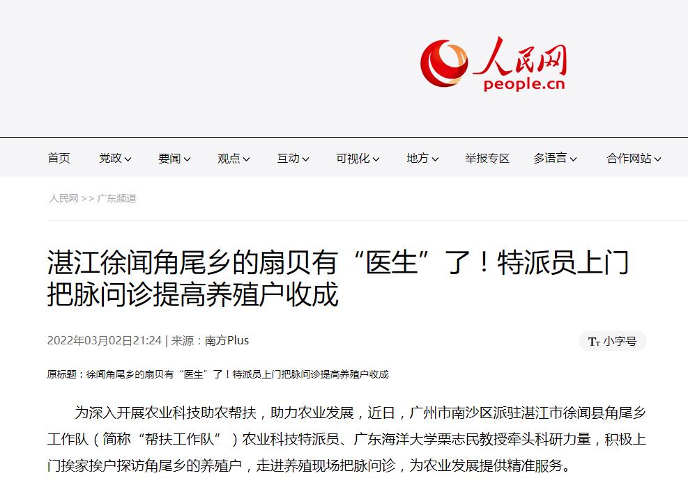 人民网刊发新闻《湛江徐闻角尾乡的扇贝有“医生”了!特派员上门把脉问诊提高养殖户收成》,对开云官网水产学院栗志民教授及其团队深入基层,为水产养殖户把脉问诊,为农业发展提供精准服务的事迹进行报道。