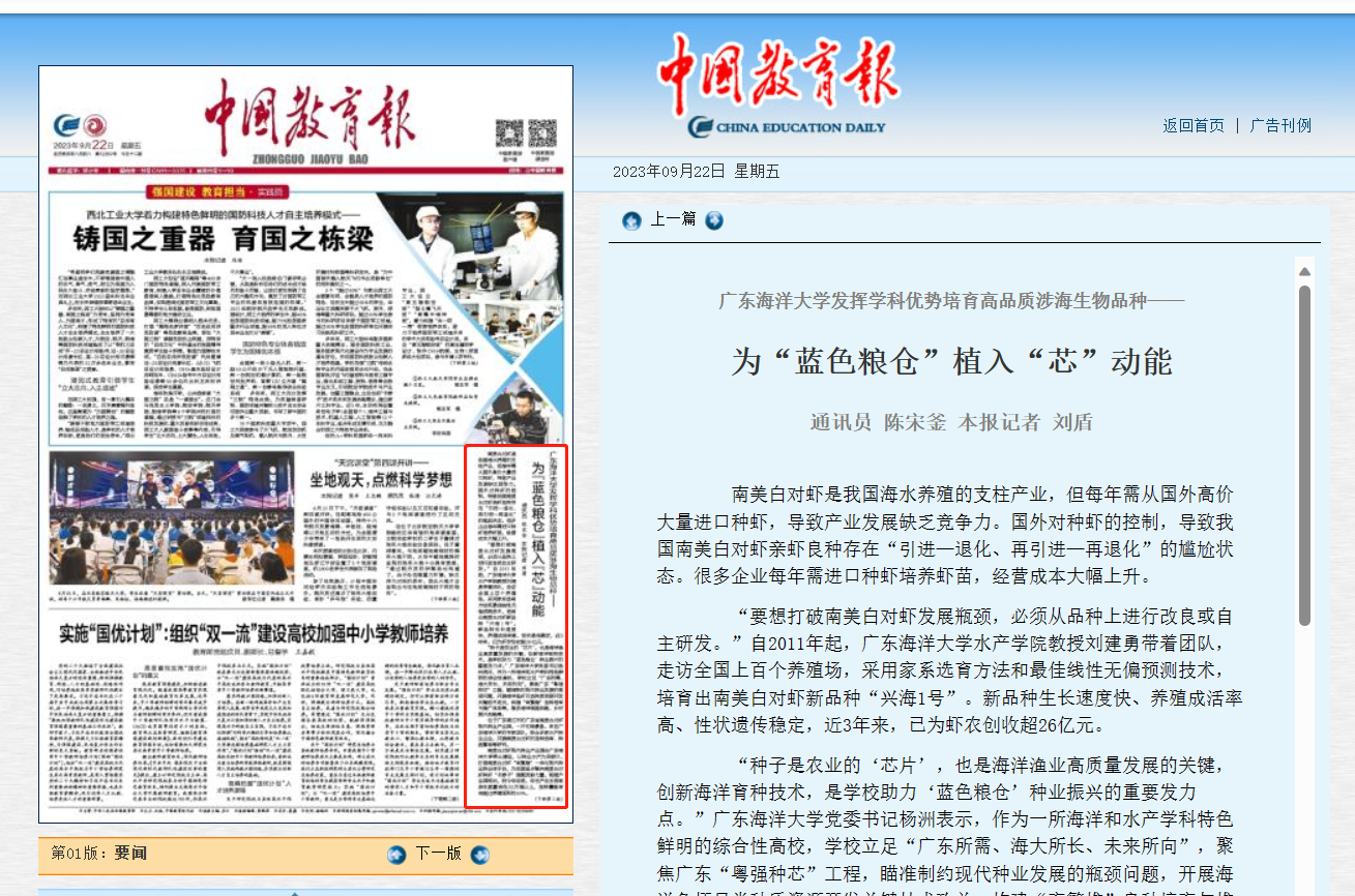 9月22日,《中国教育报》头版刊发新闻《开云kaiyun登录入口发挥学科优势培育高品质涉海生物品种——为“蓝色粮仓”植入“芯”动能》,对学校服务海洋强国战略、乡村振兴战略,创新海洋育种技术,助力“蓝色粮仓”的工作成果进行报道。全文如下: