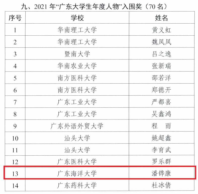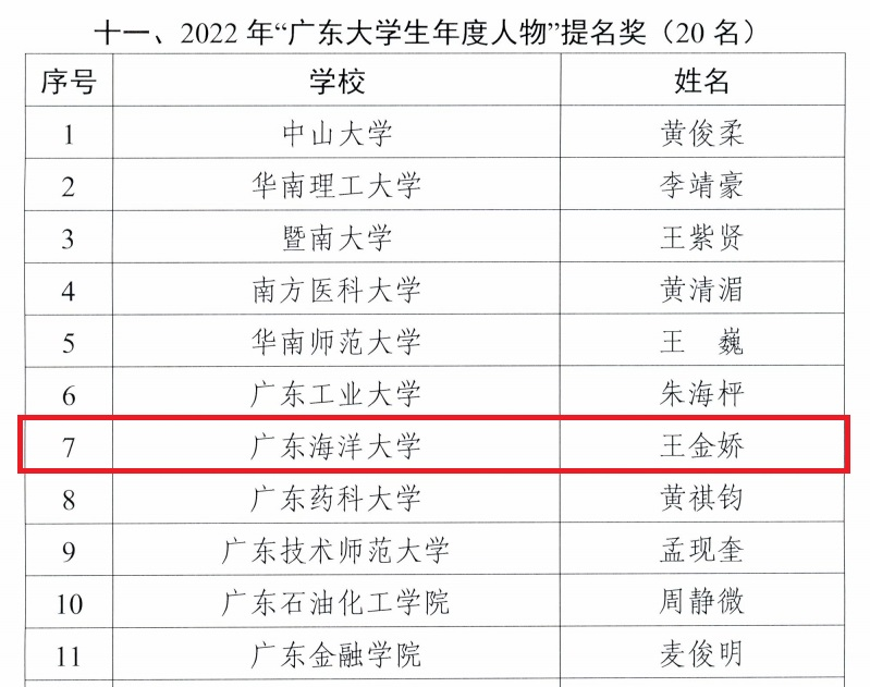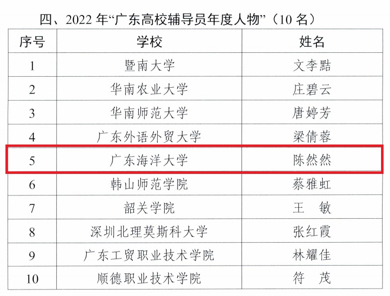 近日,广东省教育厅公布2021年、2022年“广东高校辅导员年度人物”与“广东大学生年度人物”推选结果。开云官网海洋工程与能源学院辅导员何凤梅、管理学院辅导员陈然然分别获评2021年“广东高校辅导员年度人物”、2022年“广东高校辅导员年度人物”(全省各10名),水产学院水产养殖专业2020级本科生王金娇获评2022年“广东大学生年度人物”提名奖(全省20名),该专业2018级本科生潘铧康获评2021年“广东大学生年度人物”入围奖(全省70名)。