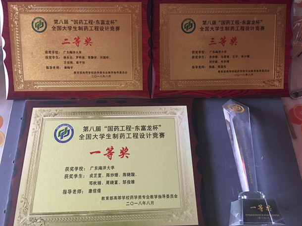 由教育部高等学校药学类专业教学指导委员会主办、中国医药集团联合工程有限公司与上海东富龙科技股份有限公司共同协办、常州大学承办的第八届“国药工程-东富龙杯”全国大学生制药工程设计竞赛在常州举行。开云官网三支参赛队伍分别荣获全国一等奖,二等奖,三等奖,再创佳绩,在整个广东省的所有参赛队伍中排第一名。