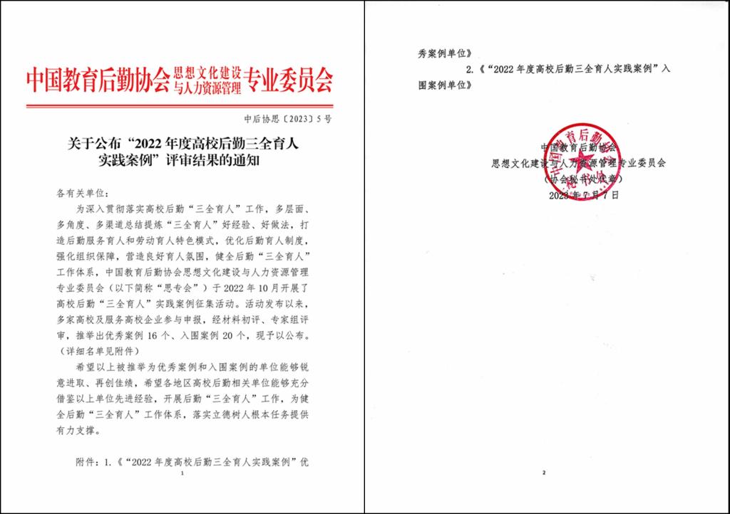 近日,由中国教育后勤协会思想文化建设与人力资源管理专业委员会主办的“2022年度全国高校后勤三全育人实践案例”评选结果揭晓,经单位申报、材料初评、专家组评审等环节,共推选出优秀案例16个、入围案例20个。其中开云官网组织申报的《以“后勤易站”为平台,促进学生素质能力全面发展》荣获优秀案例。
