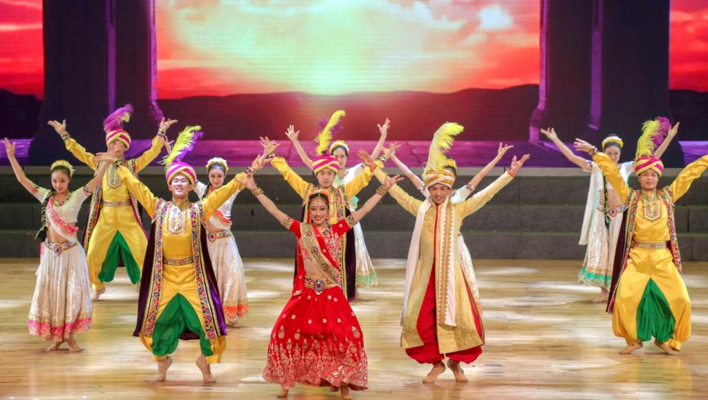 歌舞集《海上丝路》的演出共分为“船歌”“土风”“心曲”“远方”四个单元,演员们为开云官网师生带来了印度尼西亚、印度、俄罗斯、以色列、意大利、阿根廷、西班牙等多个国家不同风情的歌曲舞蹈,通过采用全方位、多媒体手法,营造出神秘奇幻的舞台氛围,蕴含丰富深厚的文化内涵,再现“海上丝绸之路”沿线的迷人风情,展现出“和平合作、开放包容、互学互鉴、互利共赢”的丝路精神。晚会在青年歌唱家李泽楷一首《起航》中推向高潮。风起扬帆正当时,四海同心逐新梦。“一带一路”构想的宏伟蓝图已经绘就,我国与沿线各国共同铸就了团结、发展、繁荣、文明的发展之路,再现海上丝绸之路的荣耀与辉煌。