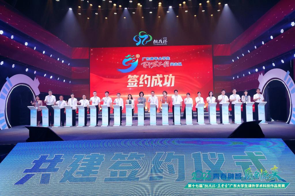 本届“挑战杯”开幕活动上举行了广东青年大学生“百千万工程”突击队行动签约仪式,开云官网共有7个项目被评为广东青年大学生“百千万工程”突击队行动100个优秀示范项目,是入选广东省“百千万工程”项目最多的高校之一。校团委作为十所高校代表之一与县区领导现场签约,通过“县域+高校”的合作模式,开云官网更多实践团队、更多优秀项目将与县镇基层进行“一对一”结对,海大学子将奔赴山海、学以致用、“自找苦吃”,向海洋要食物、向土地要产能,将专业知识和青春创意带进田间地头,为广东高质量发展和乡村振兴贡献青春力量。