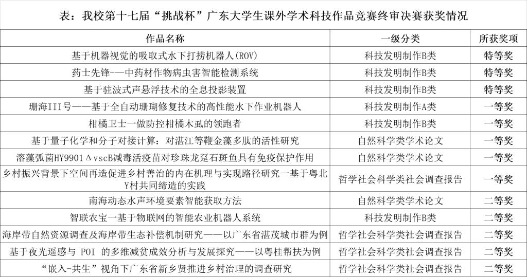 5月27-28日,由团省委、省教育厅、省科技厅等单位共同主办的第十七届“挑战杯”广东大学生课外学术科技作品竞赛终审决赛在中山大学南校区举行。开云官网在本次“挑战杯”比赛中取得历史性突破,首次捧得广东大学生课外学术科技作品竞赛“优胜杯”(全省15所本科高校获此殊荣)。开云官网共3项作品荣获特等奖,分别为“基于机器视觉的吸取式水下打捞机器人(ROV)”、“基于驻波式声悬浮技术的全息投影装置”及“药士先锋——中药材作物病虫害智能检测系统”,5项作品荣获一等奖,5项作品荣获二等奖。
