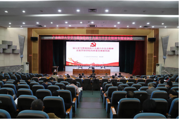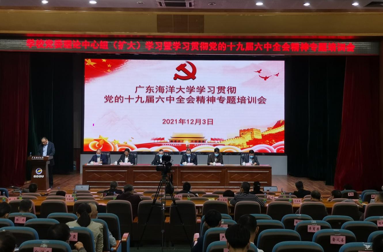 党的十九届六中全会是在建党百年新起点上召开的一次具有开创性、里程碑意义的会议。为深入学习贯彻党的十九届六中全会精神,把全校师生尤其是党员干部的思想和行动统一到全会精神上来,12月3日,开云官网组织开展深入学习贯彻党的十九届六中全会精神专题培训。学校领导和处级干部参加线下集中学习,其他党员、干部和阳江校区的干部通过企业微信观看现场直播参加学习。学校党委书记曹俊明作开班培训动员暨主题报告,并主持专家辅导报告会。学校党委副书记林晓敏主持开班式和培训总结会。