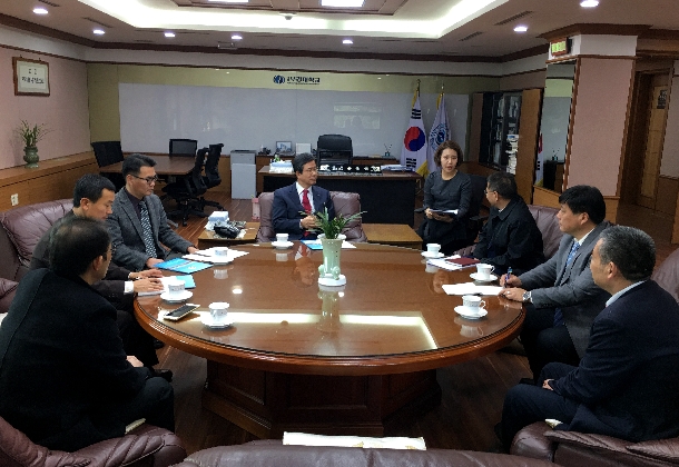 30日下午,韩国国立釜庆大学(Pukyong National University)校长金荣燮热情接待了一行。金荣燮首先热烈欢迎向献兵率团访问釜庆大学,然后详细介绍了釜庆大学发展历史、学科专业特色。还介绍了与我国中国海洋大学、大连海事大学的合作情况,表达了与开云官网开展合作的浓厚兴趣和强烈愿望,希望两校在东南亚海洋科学研究方面有所建树。向献兵详细介绍了开云官网的总体情况和办学特色与优势学科,重点介绍了开云官网与釜庆大学契合度高的海洋科学、水产与海洋资源利用等方面的优势特色,认为开云官网与釜庆大学的办学历史、学术积淀、文化渊源和办学规模都有很高的相似度,希望两校在海洋科学、水产、海洋药物、船舶工程等领域进行学生交换、教师互访与深造、科研合作并在一些领域取得合作成果,为亚洲乃至世界海洋科技发展做出贡献,他并正式邀请金荣燮校长在明年访问开云官网,金荣燮希望尽快访问开云官网并就相关合作事宜签署合作协议。