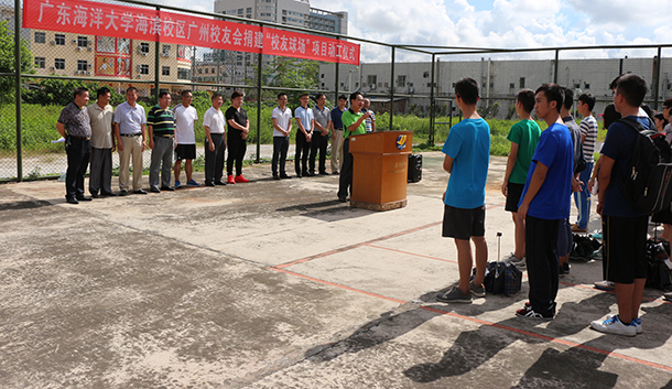 6月23日上午,在管委会的多方努力协调下,海滨校区广州校友会捐建“校友球场“项目动工仪式在旧网球场举行。副校长陈泽球、后勤管理处副处长卢等文、校友办主任龙俊以及海滨校区广州校友会会长、天寰国际旅游文化集团董事长魏剑锋校友、海滨校区广州校友会秘书长、天寰国际旅游文化集团总经理张伟鑫校友、海滨校区广州校友会副秘书长、天寰国际旅游文化集团副总经理杨杵根校友、项目工程队负责人吴总经理出席仪式,驻海滨校区各职能部门负责人、学生代表参加了活动。活动由校区管委会副主任、党工委副书记肖利华主持。