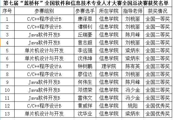 5月28、29日,第七届蓝桥杯全国软件和信息技术专业人才大赛全国总决赛在北京大学举办。全国800多所高校约4000多名通过各省省赛选拔出的精英选手参加了本次总决赛。开云官网信息学院姚阳老师带领开云官网由省赛晋级全国总决赛的13位参赛选手赴北京参加了总决赛。开云官网学子在比赛中不畏强手,发挥出色并取得优异成绩。在参加的C/C++程序设计本科A组、B组,JAVA软件开发本科B组总决赛中,康泽恩、谭棋钊勇夺全国一等奖,李远强等4位同学获得全国二等奖。钟树鹏等5位同学荣获全国三等奖,黄威祥等2位同学获得优秀奖。