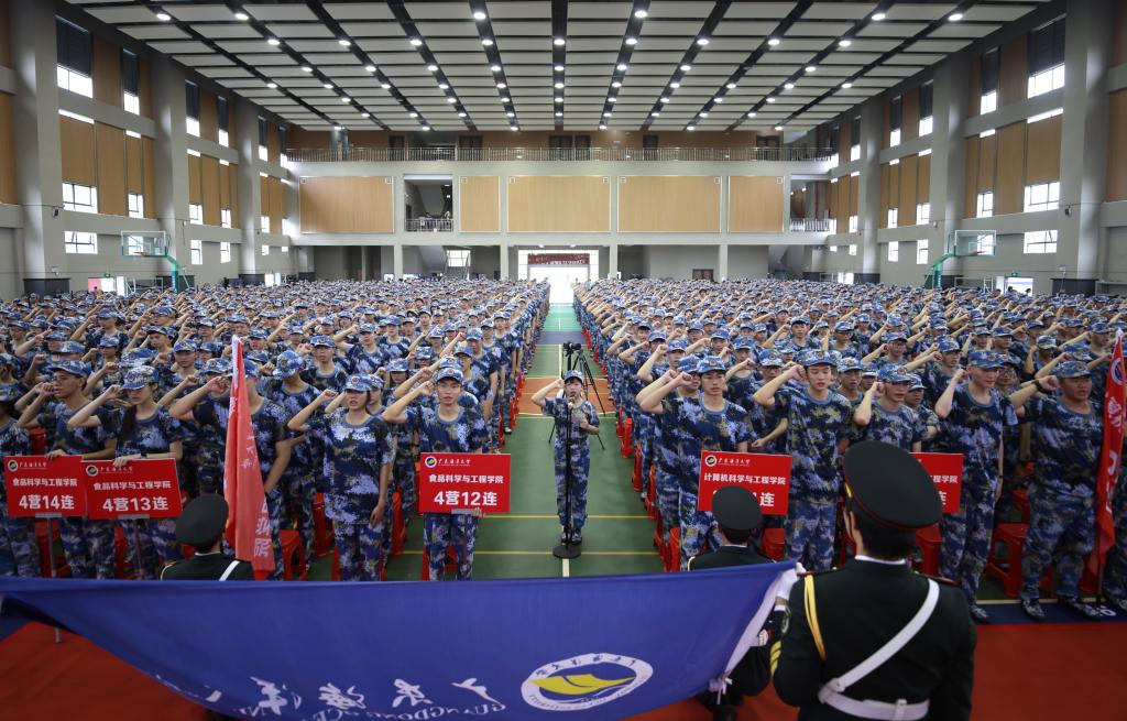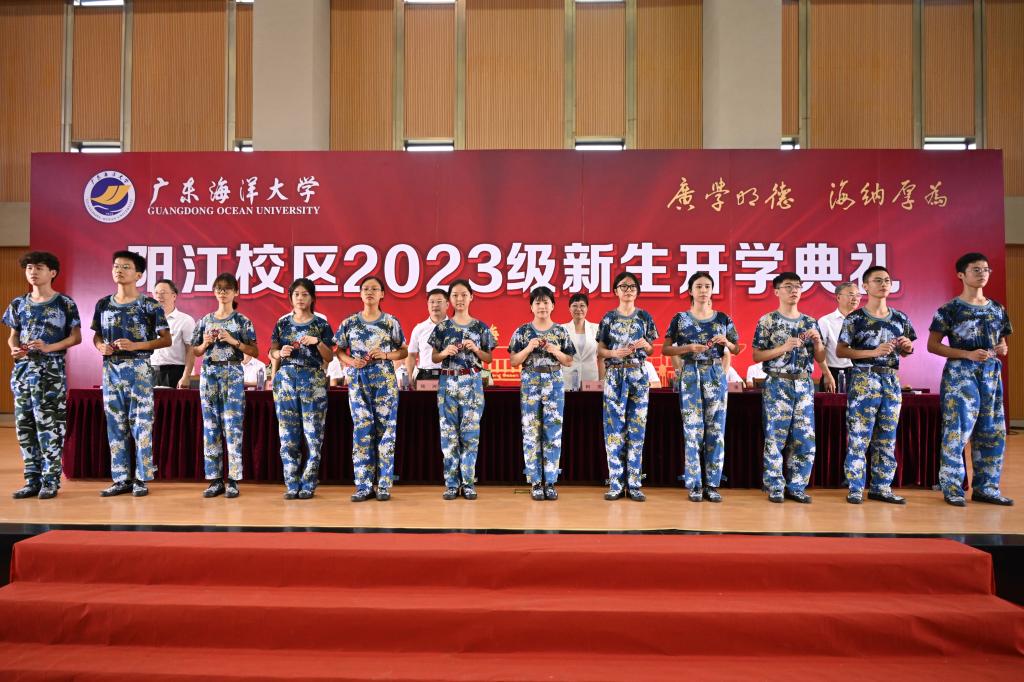 典礼中,学校及阳江市领导为新生代表颁发校徽,全体新生集体宣誓,在全场师生齐唱《我和我的祖国》。