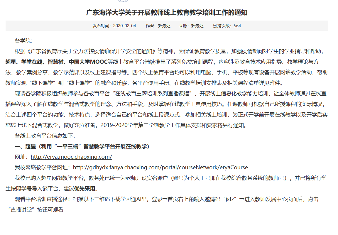 为保证教育教学质量,加强疫情期间对学生的学业指导和帮助,教务处积极组织教师参与超星、学堂在线、智慧树、中国大学MOOC等线上教育平台的在线教育主题培训系列直播课程,开展线上信息化教学能力培训,为正式开学前开展在线教学以及开学后实施线上线下混合式教学,做好充分准备。