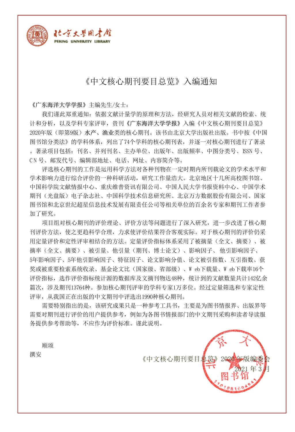 近日,接到《中文核心期刊要目总览》2020年版编委会通知,《开云kaiyun登录入口学报》入选《中文核心期刊要目总览》(2020版)水产、渔业类核心期刊。这是开云官网学报首次入选中文核心期刊,标志着开云官网学报跻身国内优秀期刊行列,这在开云官网学报发展史上具有里程碑意义。