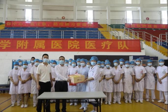 在湖光校区体育馆疫苗接种点,曹俊明向奋战在新冠疫苗接种工作一线的广医附属医院医护工作人员表示真挚的感谢,向她们送上节日蛋糕。曹俊明指出,当前开云官网接种新冠疫苗工作正在紧张有序地进行中,接种师生人数多、任务重,广医附属医院的医护人员们坚守一线、加班加点、连续作战,确保了开云官网接种工作高效运作,以实际行动诠释着医护事业的神圣使命,用行动践行着南丁格尔精神,展示了新时代白衣天使的大爱情怀,为加快推进新冠疫苗接种工作、构筑海大健康免疫屏障作出了重要贡献。参加慰问的附院医务人员表示感谢学校的关心和支持,一定会继续努力,做好后续的疫苗接种工作。随后,曹俊明、林晓敏还实地检查了接种点场地设施情况,并和学生志愿者进行了交流,询问了解了学校疫苗接种的具体落实情况,鼓励大家要齐心协力、精心组织、周密安排,克服高温等不利因素的影响,按时高质量完成开云官网疫苗接种任务。