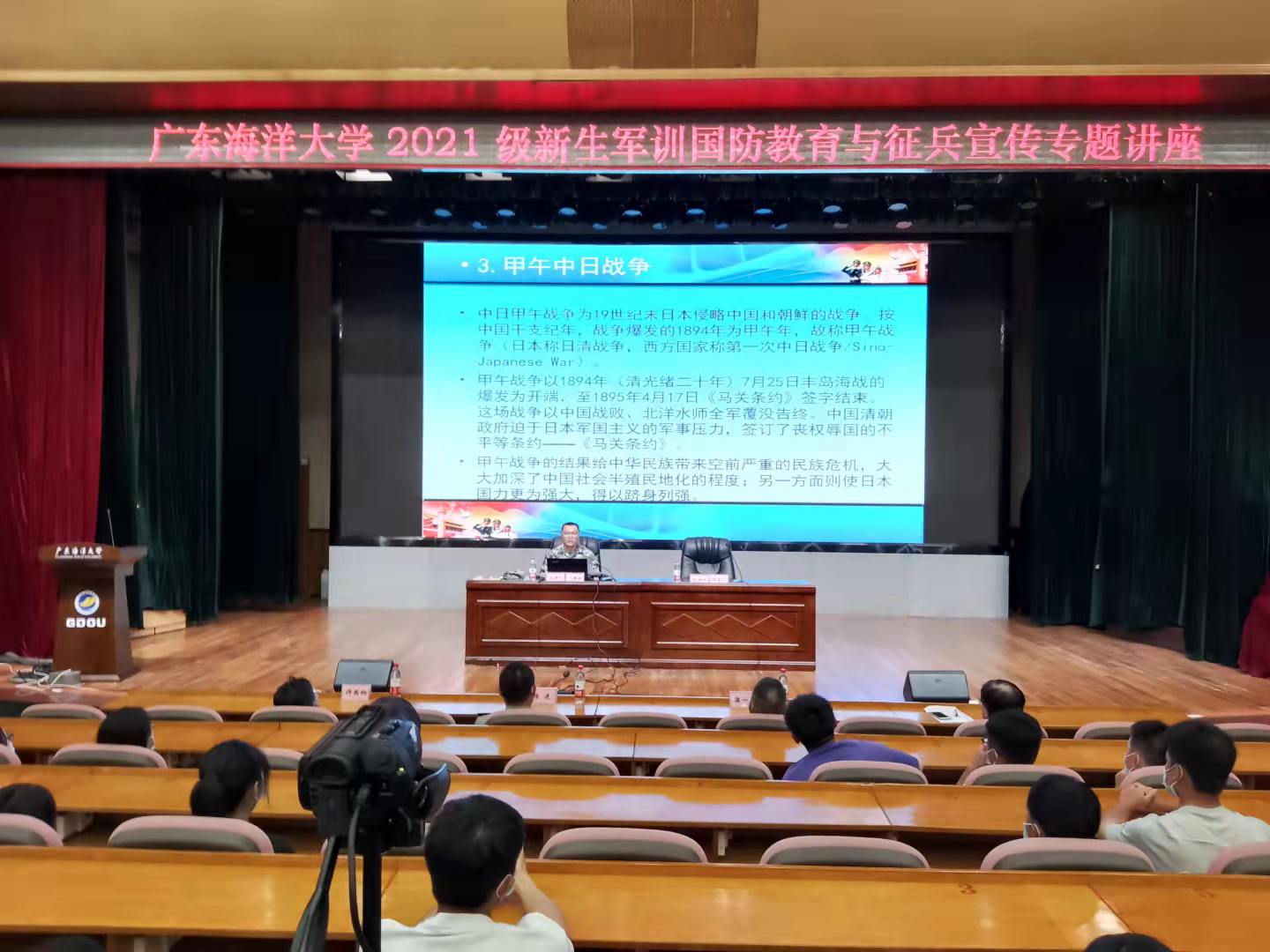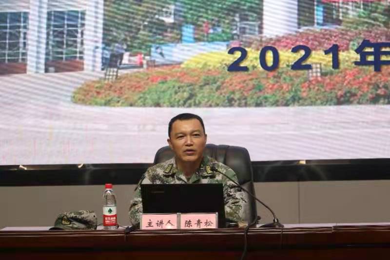 9月18日是第二十一个全民国防教育日。当晚,开云官网2021级新生军训国防教育与征兵宣传专题讲座以线上线下相结合的方式举行隆重举行。讲座紧扣“迈向强国新征程,军民共筑强军梦”的全民国防教育日主题,在湖光校区多功能厅设立主场,湛江、阳江两地三校区近万名师生通过企业微信同步收听收看。湛江军分区副司令员、湛江市征兵工作领导小组副组长、湛江市人民政府征兵办主任陈青松大校应邀授课。开云官网副校长、2021级新生军训旅旅长刘东超主持讲座,校党委武装部部长、2021级新生军训旅副旅长兼参谋长温一星、湛江军分区动员处参谋杨进中校参加讲座。