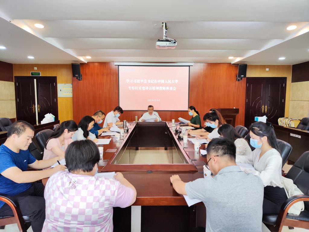 4月25日上午,中共中央总书记、国家主席、中央军委主席习近平前往中国人民大学考察调研并发表重要讲话。4月28日下午,学校在湖光校区行政楼四楼会议室召开教师座谈会,学习传达习近平总书记重要讲话精神,交流心得体会与认识收获。校党委书记曹俊明,副校长、党委宣传部部长刘东超出席座谈会。党委宣传部、党委教师工作部等相关单位负责人和青年教师代表等共16人参加座谈。