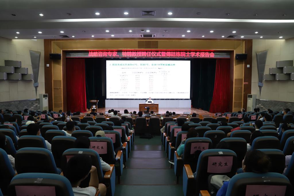 聘任仪式结束后,傅廷栋院士作了题为《耐盐碱油菜与利用作饲料、绿肥研究进展》的学术报告,介绍了其所开展的耐盐碱油菜材料筛选和品种鉴定研究,并从耐盐碱油菜具有修复和利用盐碱地的作用,以及收获的耐盐碱油菜是优质的饲料和改良盐碱地的绿肥等方面,阐明种植耐盐碱油菜兼具“利用”与“改良”盐碱土的特殊优势。傅廷栋院士表示,耐盐碱油菜是改良盐碱地最有前景的大田作物。结合海大的耐盐碱水稻研究,研制推广“稻—稻—油”周年轮作复种模式,可以做到春季有花赏、有菜吃,养殖有饲料、土壤有养料,共同促进华南滨海地区的乡村振兴事业。