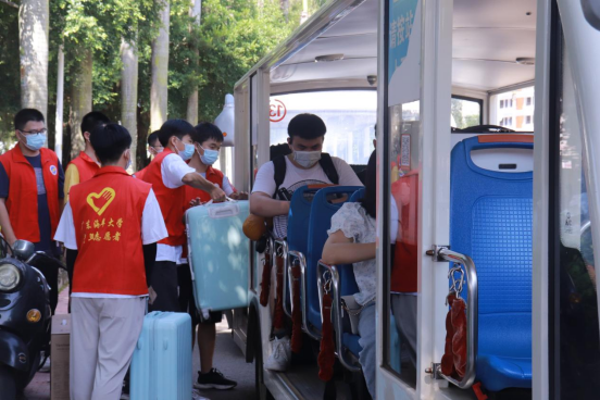 返校期间,秩序井然。各职能部门、各学院辅导员、学生志愿者、医护人员通力合作,全方位全流程地守护返校学生安全和健康。校门前,返校学生在志愿者的引导下出示场所通行码、健康码、行程卡、返校申请审核结果并进行行李消毒、体温检测、人脸识别等流程。现场还设置了核酸检测点和治安报警点,湛江市外的学生到湛后需再次进行核酸检测方可入校。学校车队统筹安排车辆来回学校与车站全天候接送学生到校。保卫人员对报到现场周边的秩序进行维护和交通管制引导。资产经营有限公司对环校车的行车路线进行调整,平衡返校学生接送与校内学生出行。学生公寓门口,返校学生再次进行行李消毒、体温检测、人脸识别,宿舍管理员对学生进行信息核验无误后,学生才能正式进入宿舍。