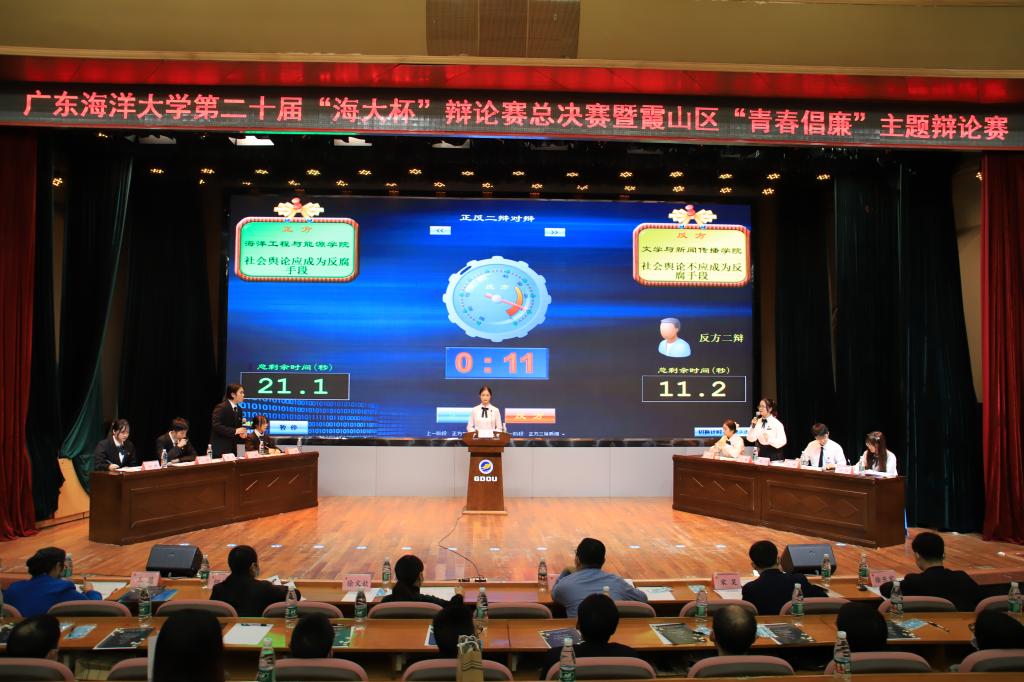 本次比赛历经初赛、复赛和半决赛,海洋工程学院与能源学院辩论队和文学与新闻传播学院辩论队进入总决赛。总决赛在一首《平凡天使》歌曲拉开序幕,正反双方围绕“社会舆论应/不应成为反腐手段”辩题展开激烈辩论,用详细的数据和有力的事实为依据阐明己方观点和立场,同时抓住对方辩手的漏洞进行犀利提问,正反双方针锋相对、互不相让,唇枪舌战之间,思维碰撞、智慧闪光,精彩的交锋让现场高潮迭起,赢得观众阵阵热烈掌声。