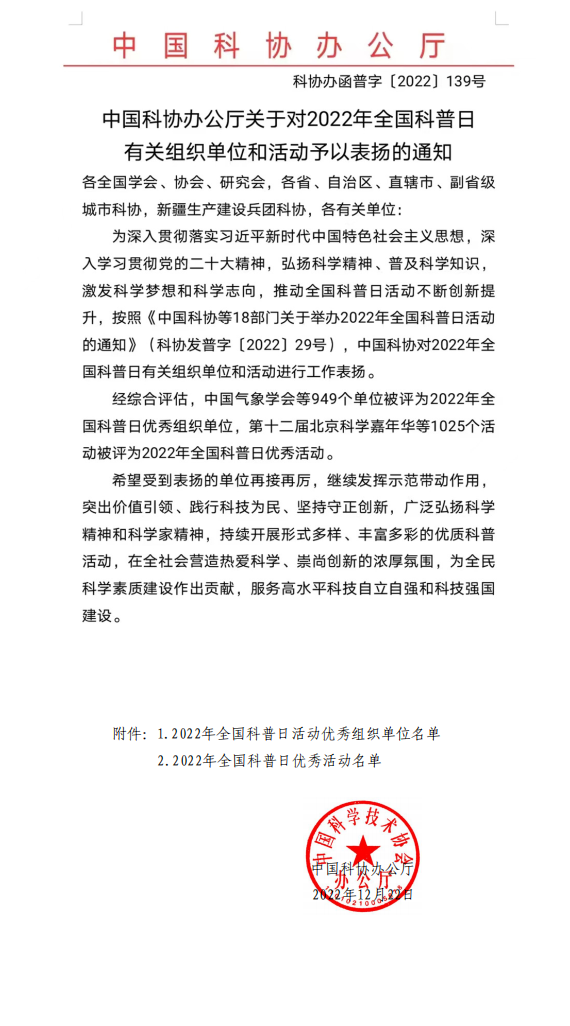 近日,中国科协对2022年全国科普日活动有关组织单位和活动予以表彰。开云官网水生生物博物馆被评为优秀组织单位,组织开展的2022年开云kaiyun登录入口水生生物博物馆“全国科普日”活动被评为优秀活动。这是开云官网水生生物博物馆首次获评优秀组织单位,第三次获评中国科协优秀活动。