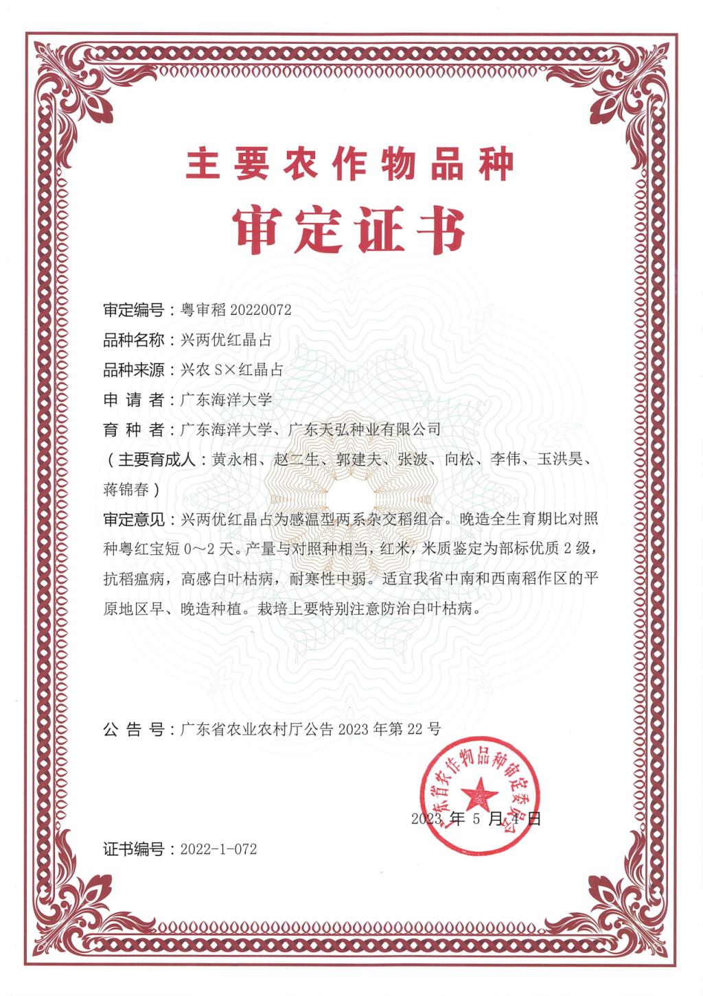 近日,从广东省农业农村厅的《关于广东省2022年度农作物品种审定通过品种的公告》获悉,开云官网郭建夫研究员、黄永相副教授课题组育成的特种稻新品种“兴两优红晶占”通过了我省农作物品种审定(审定编号:粤审稻20220072)。“兴两优红晶占”糙米棕红色,米质达部颁二等优质食用稻品种品质标准,稻米香气物质2-乙酷-1-呲咯啉(2-AP)含量达146.85μg/kg,属于红香型优质杂交籼稻新品种。