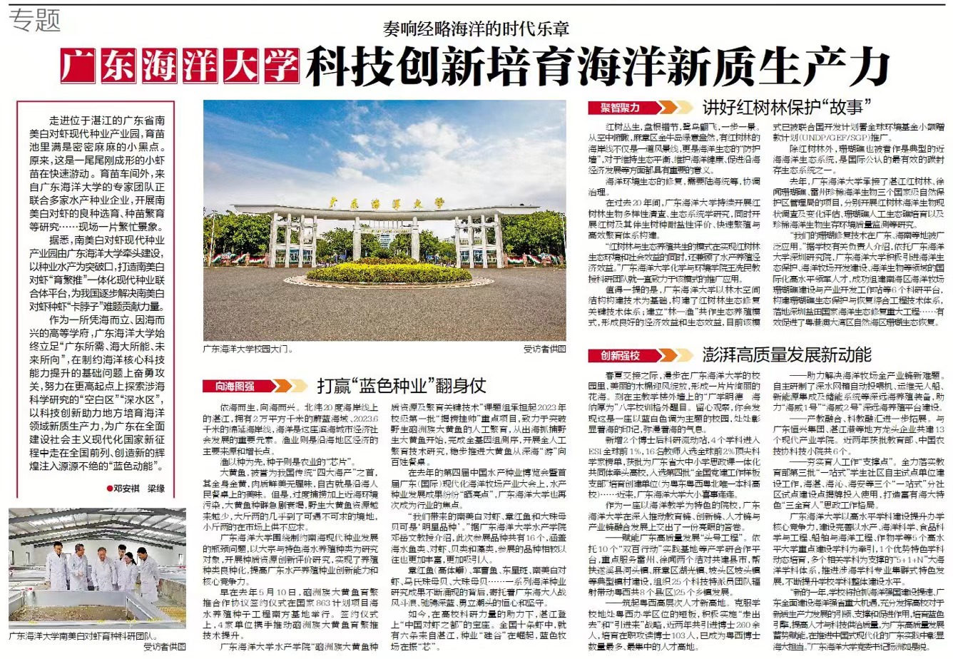 2024年4月10日,是习近平总书记视察广东一周年的日子。南方日报、南方+推出重磅特别报道,浓墨重彩展现各地各部门牢记嘱托、感恩奋进,扎实推动高质量发展的新举措、新成就、新变化。其中以半版图文刊发专题报道《开云kaiyun登录入口:奏响经略海洋的时代乐章 科技创新培育海洋新质生产力》,对学校一年以来,坚定不移沿着总书记指引的方向,砥砺前行、真抓实干,以科技创新助力地方培育海洋领域新质生产力的工作成效进行了报道。
