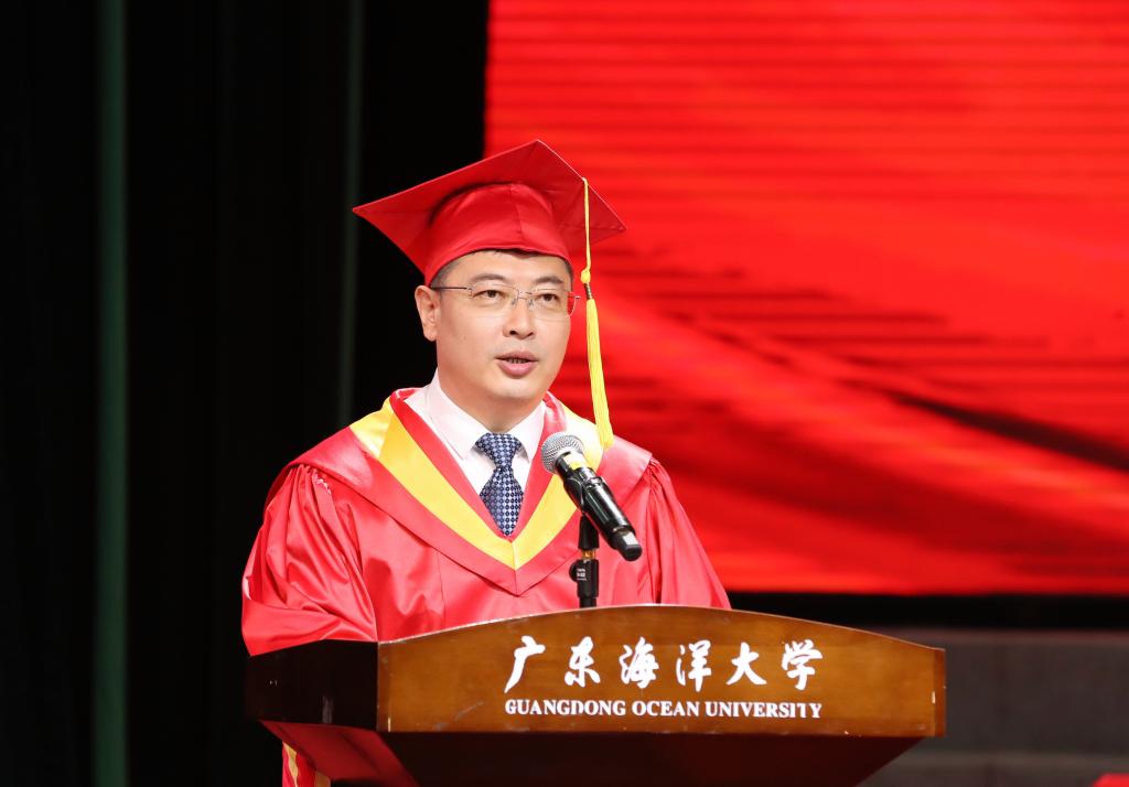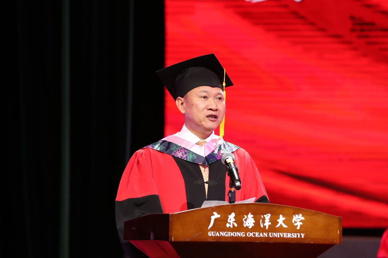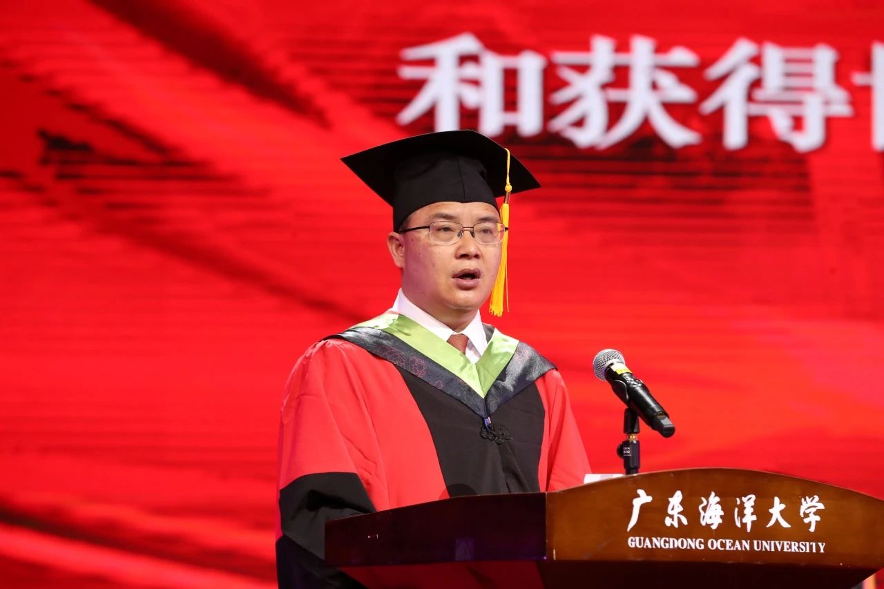 水产学院李忠炉副教授作为教师代表发言,勉励广大毕业生要保持一颗谦逊的心、好奇的心、爱国的心,牢记自己的责任和使命,不忘海大“三能人才”底色,将个人的奋斗与时代的脉搏紧密结合,为祖国的繁荣和富强贡献自己的力量。