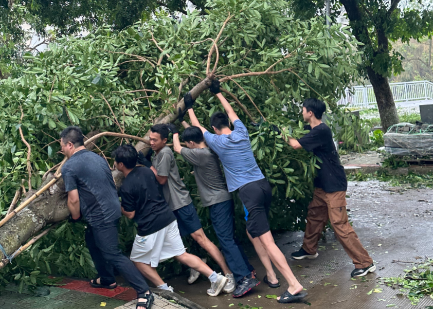 党旗高扬,闻风而动。面对超强台风“摩羯”,全校各级党组织、党员闻令而动,充分发挥党组织战斗堡垒作用和党员先锋模范作用,冲锋在前,开展防灾知识宣传、应急抢险、救援保障和灾后恢复等工作,以实际行动践行初心使命。“我报名!”“算我一个!”机关党委迅速成立防汛防风党员先锋队,各二级党组织积极动员,广大党员干部、师生热烈响应,全力投入救灾复建工作,组建行动队、服务队,凝聚守护美好校园的强大合力。他们迅速投入到校园环境清理工作,合力搬移粗壮树干、清运路面树枝杂物、拿起扫帚和铁锹等工具清理倒伏断枝和落叶,用实际行动彰显了党员担当。