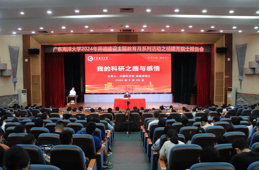 为进一步加强新时代师德师风建设,大力弘扬教育家精神,加快建设教育强国,9月29日上午,中国科学院院士、中国科学院水生生物研究所一级研究员桂建芳应邀来校作专题报告,学校党委书记杨洲、副校长谭北平、人力资源部主要负责领导及湖光校区师生代表400余人现场聆听,阳江校区师生通过企业微信直播参加了此次报告会。报告会由谭北平主持。