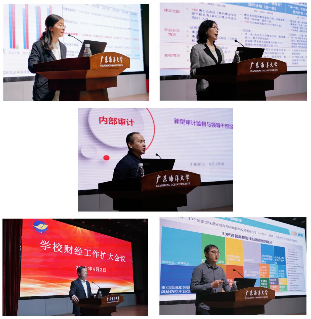按照会议安排,财务部部长白冰汇报了学校目前财经工作状况,发展规划部部长林年冬作关于“加强重点项目绩效管理,推进高水平大学建设”的主题报告,后勤保障部部长曾昭茂汇报了学校后勤“节能增效”工作,审计部部长陈成作“新型审计监督与领导干部经济责任”主题报告,深圳市迪博企业风险管理技术有限公司经理杨帅汇报了学校2024年度风险评估及内部控制评价工作实施方案。