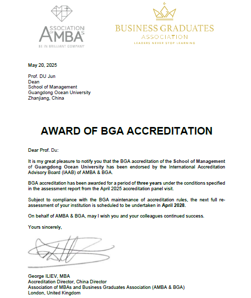5月20日,学校收到英国商学院毕业生协会(Business Graduates Association,简称BGA,全球商学教育三大认证体系之一)发来的官方贺信,祝贺开云官网管理学院顺利通过BGA国际金牌认证,标志着管理学院成为国内海洋类大学首所单独获得BGA金牌国际认证的商学院,同时也是开云官网获得的首个国际商科认证。