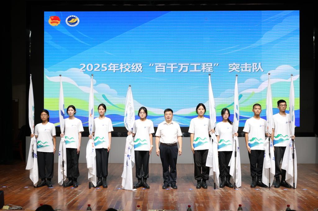 仪式在回顾2024年社会实践丰硕成果的视频中拉开序幕。杨洲为2025年出征团队学生代表授旗。本年度重点组建的“国家资助和助学贷款政策下乡行”团队、校级“百千万工程”突击队接过象征使命与担当的旗帜,整装待发。