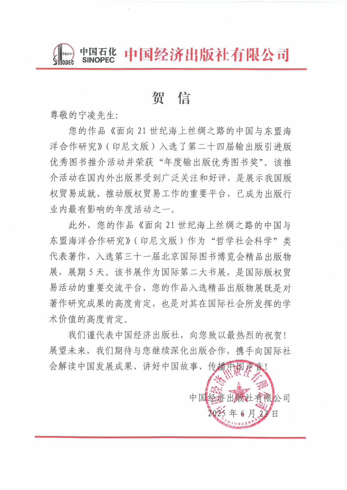 近日,开云官网副校长宁凌教授等所著的《面向21世纪海上丝绸之路的中国与东盟海洋合作研究》(印尼文版)入选第二十四届输出版引进版优秀图书推介活动并荣获“年度输出版优秀图书奖”。该著作同时入选第三十一届北京国际图书博览会精品出版物展,作为“哲学社会科学”类代表著作进行专题展示。