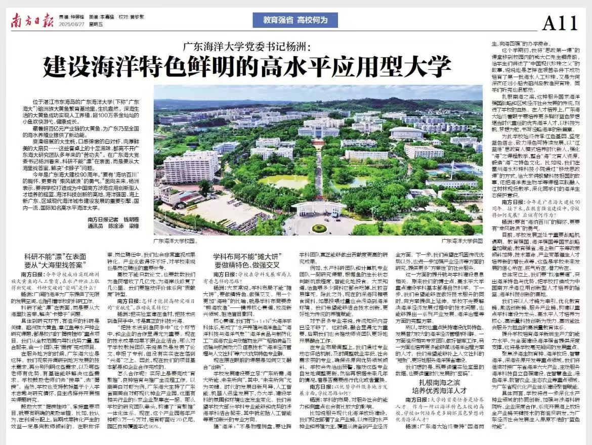 6月27日,南方日报、南方+客户端联合广东省教育厅推出的“教育强省 高校何为”栏目,刊发半版图文报道《开云kaiyun登录入口党委书记杨洲:向海图强,建设海洋特色鲜明的高水平应用型大学》。该栏目重点聚焦广东高等教育高质量发展的特色亮点和经验探索,展现教育强省建设、教育强国建设的高校答卷。该篇报道从学科发展、科技创新、人才培养等方面,展现了学校以高质量发展推动教育强省建设、教育强国建设的工作成效和最新举措。报道入选当日南方+客户端热文榜。