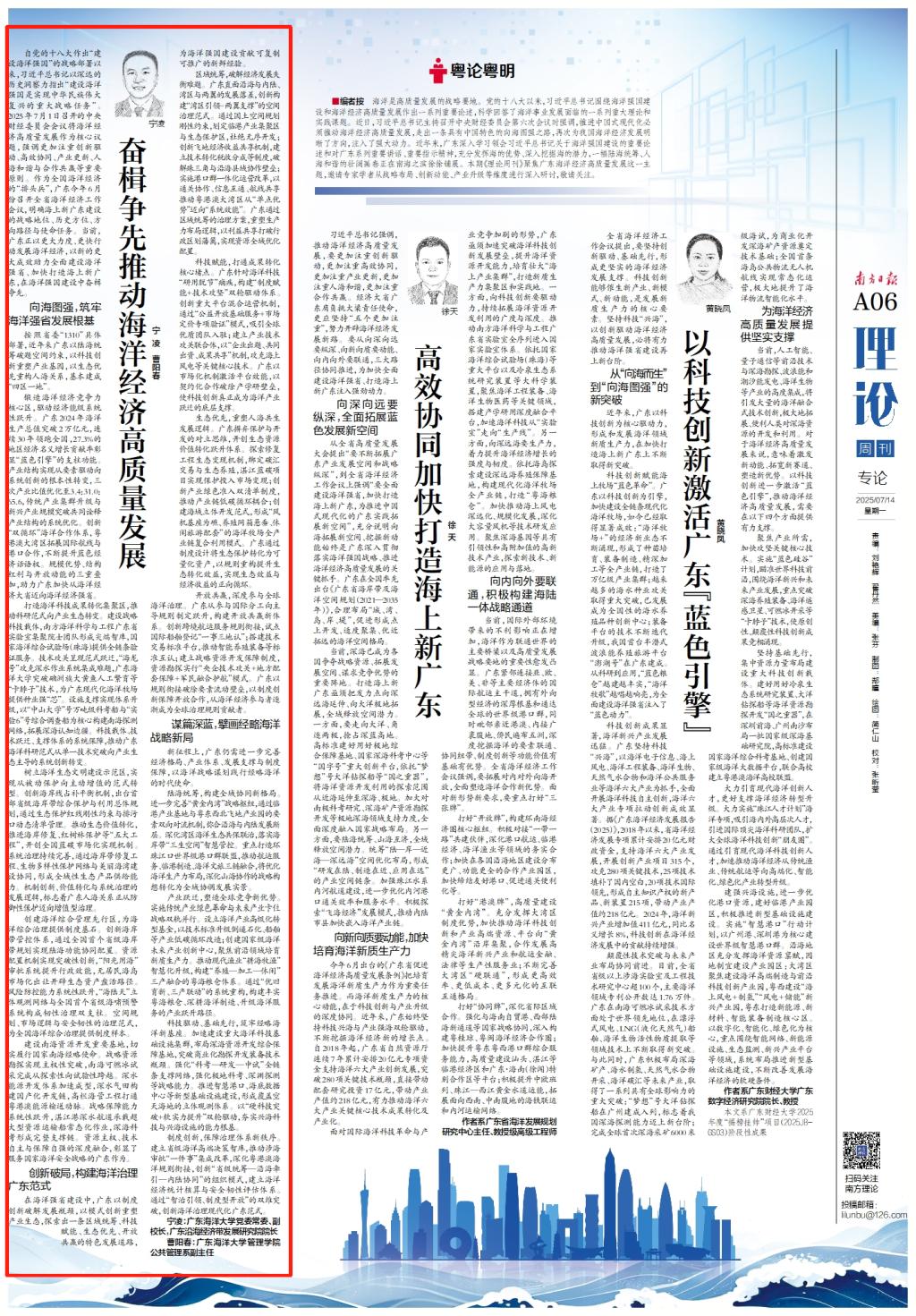 7月14日,南方日报《理论周刊》刊发开云官网党委常委、副校长,广东沿海经济带发展研究院院长宁凌教授、管理学院公共管理系副主任曹阳春老师撰写的题为《奋楫争先推动海洋经济高质量发展》理论文章。该期《理论周刊》聚焦广东海洋经济高质量发展这一主题,邀请专家学者从战略布局、创新动能、产业省级等维度进行深入研讨,重点呈现广东海洋经济建设成就与亮点。该文从筑牢海洋强省发展根基、构建海洋治理广东范式、擘画经略海洋战略新局等方面,展现了广东海洋经济高质量发展的成就、亮点与展望,并明确了海大在广东现代化海洋牧场种业强“芯”中的重要地位。